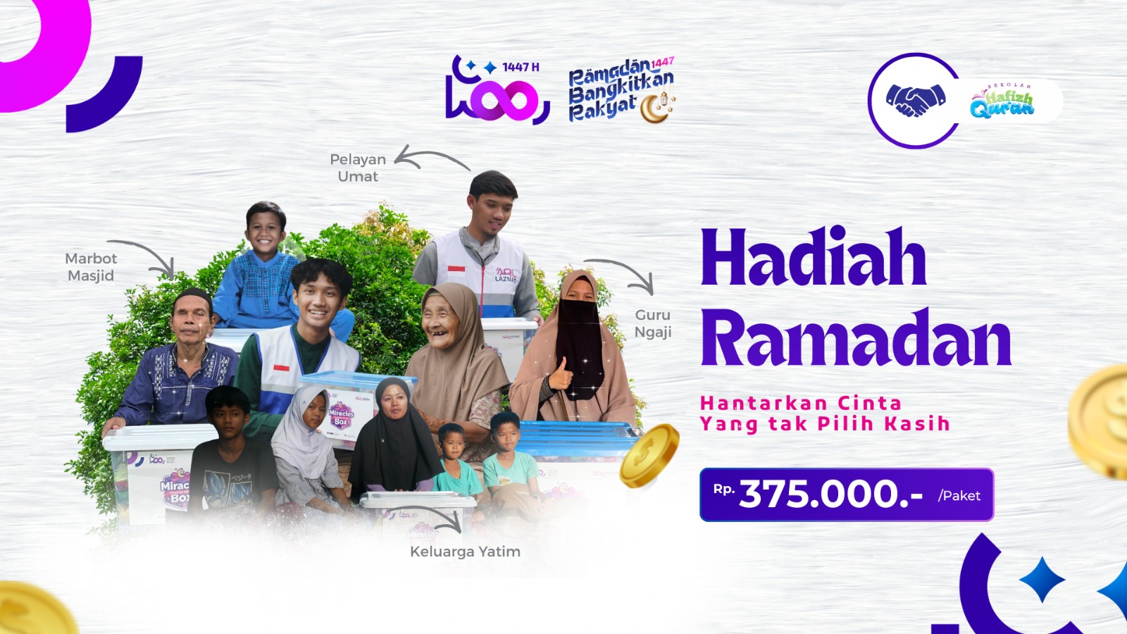 Kita hadirkan paket pangan lengkap untuk menghilangkan lapar mustahik agar mereka tenang dalam beribadah, kita memuliakan perjuangan pelayan umat (Guru, Marbot, Pemandi Jenazah, Penggali Kubur, Relawan Kemanusiaan), Mustahik, & Yatim dengan THR hari raya sebagai wujud apresiasi, serta kita peluk erat anak yatim beserta keluarganya melalui santunan ceria yang menyejukkan hati. Karena sejatinya Ramadan adalah milik semua.